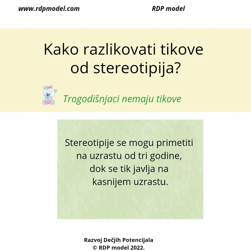 Tikovi se razlikuju od stereotipija, koje se javljaju na ranijem uzrastu kod dece.
